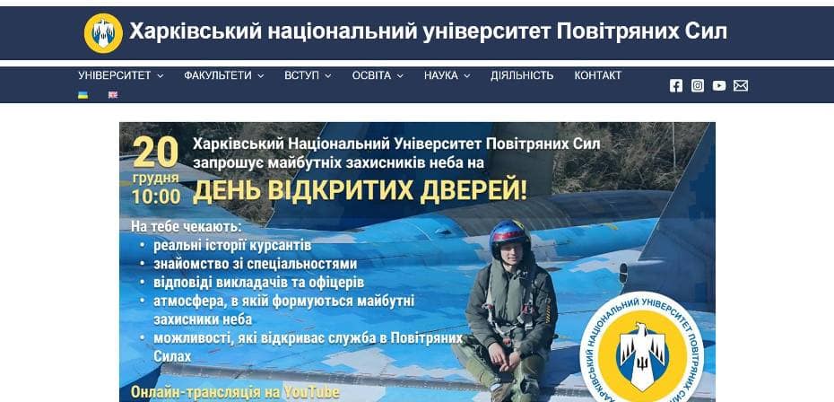 20 грудня 2025 року о 10.00 в Харківському національному університеті Повітряних Сил імені Івана Кожедуба відбудеться День відкритих дверей (на платформі YOUTUBE в режимі on-line) за посиланням https://hups.mil.gov.ua/den-vidkritix-dverej/МЕТА: ознайомлення майбутніх абітурієнтів зі спеціальностями підготовки, умовами вступу, навчання, побуту, забезпечення та… Читати далі »День відкритих дверей у Харківському національному університеті Повітряних Сил ім. І. Кожедубова