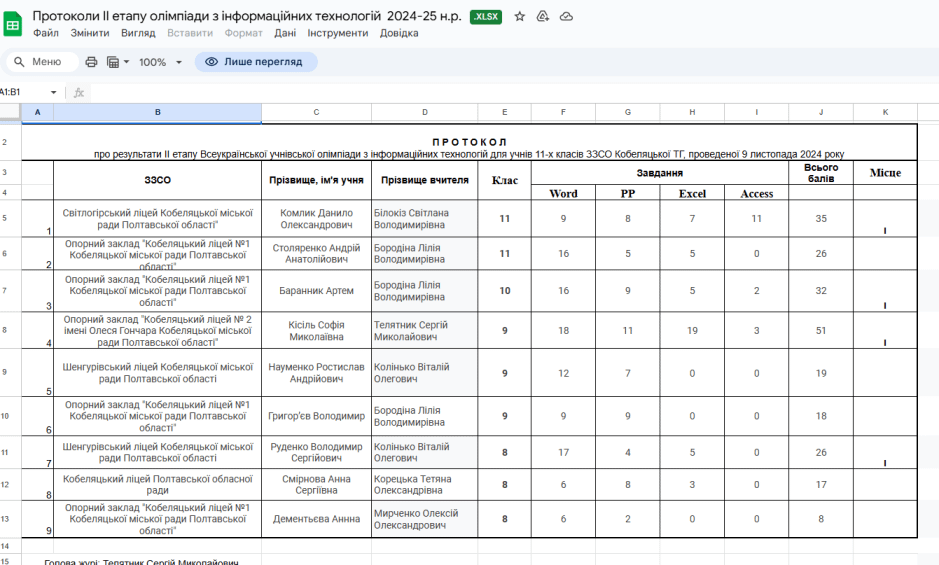 9 листопада в Кобеляцькій територіальній громаді стартував другий етап Всеукраїнських учнівських олімпіад з навчальних предметів. Учень 11 класу Світлогірського ліцею Комлик Данило виборов перше місце серед учнів 11 класів на олімпіаді з інформаційних технологій, вчитель Білокіз С. В.. Адміністрація, педагогічний та батьківсько-учнівський колективи щиро вітають переможця з високим результатом на олімпіаді.