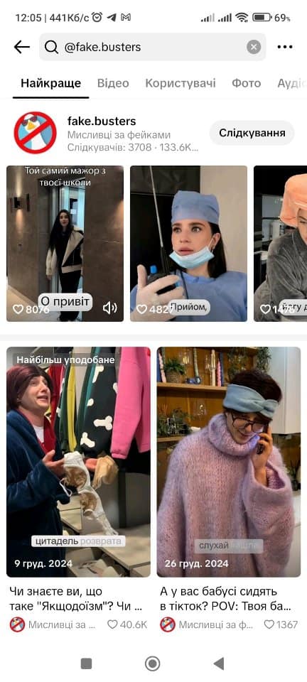 Серед тем на каналі пропонуються такі: як вберегти свої персональні дані; як розпізнати шахрайство, ботів, вигаданий та маніпулятивний контент; анонімні авторитети з інтернету як ненадійне джерело інформації та інші. Вдалим виглядає формат коротких відео-скетчів з акторами: у кожній серії герої потрапляють в різні життєві онлайн-пастки, сумніваються в інформації із соціальних мереж і намагаються розібратися, як слід реагувати на очевидне шахрайство, цькування, маніпуляції та фейки. Канал доступний за посиланням: https://www.tiktok.com/@fake.busters.