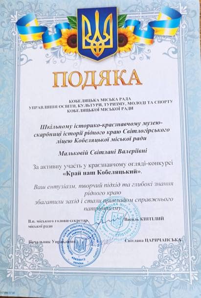 Члени Ради історико – краєзнавчого музею при Світлогірському ліцеї активно долучилися до конкурсу у номінації «Кращий історико- краєзнавчий музей при навчальному закладі». На конкурсі були представлені конкурсні матеріали (в паперовому та електронному вигляді), а також оформлена виставка з пошуковими роботами та найціннішими експонатами музею.
