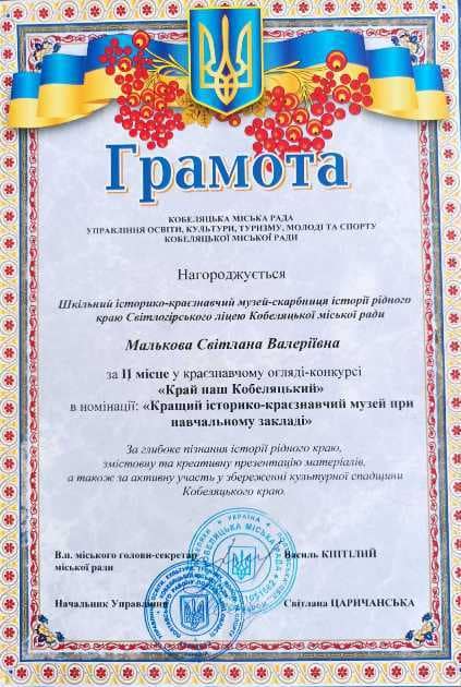 За активну участь у збереженні культурної спадщини наш музей нагороджений грамотою за ІІ місце у краєзнавчому конкурсі.