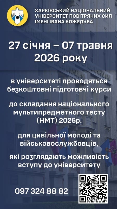 Харківський національний університет Повітряних Сил імені Івана Кожедуба з метою проведення профорієнтаційної роботи та інформування молоді про можливості здобуття військової освіти повідомляє про заплановані заходи у січні 2026 року, а саме: